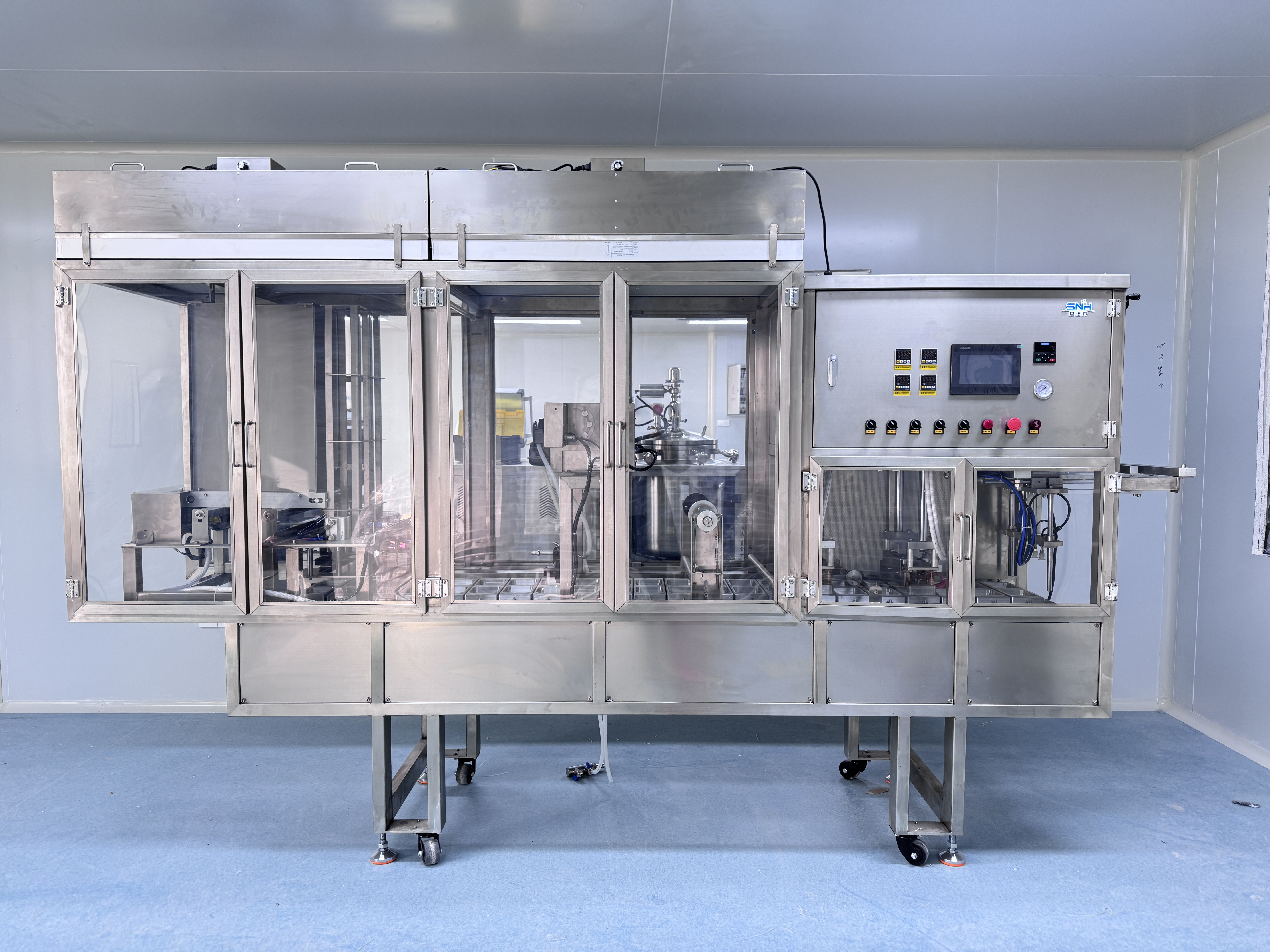 SNH-LX-2J/4J无菌灌装流水线采用凸轮分割器运转方式,触屏PLC控制器,可编程逻辑控制器,具有自动落盒,自动灌装,两道热封,切膜,自动出盒等功能。本机采用智能数字显示温度控制系统封口温度,温度误差小于±2%,封口强度高密封性好。机身采用不锈钢焊接设计,符合相关的食品卫生标准。设备的运转更加平稳,安全,灌装无喷溅及泄露,封口质量佳,大大提高了设备的生产效率和使用寿命。